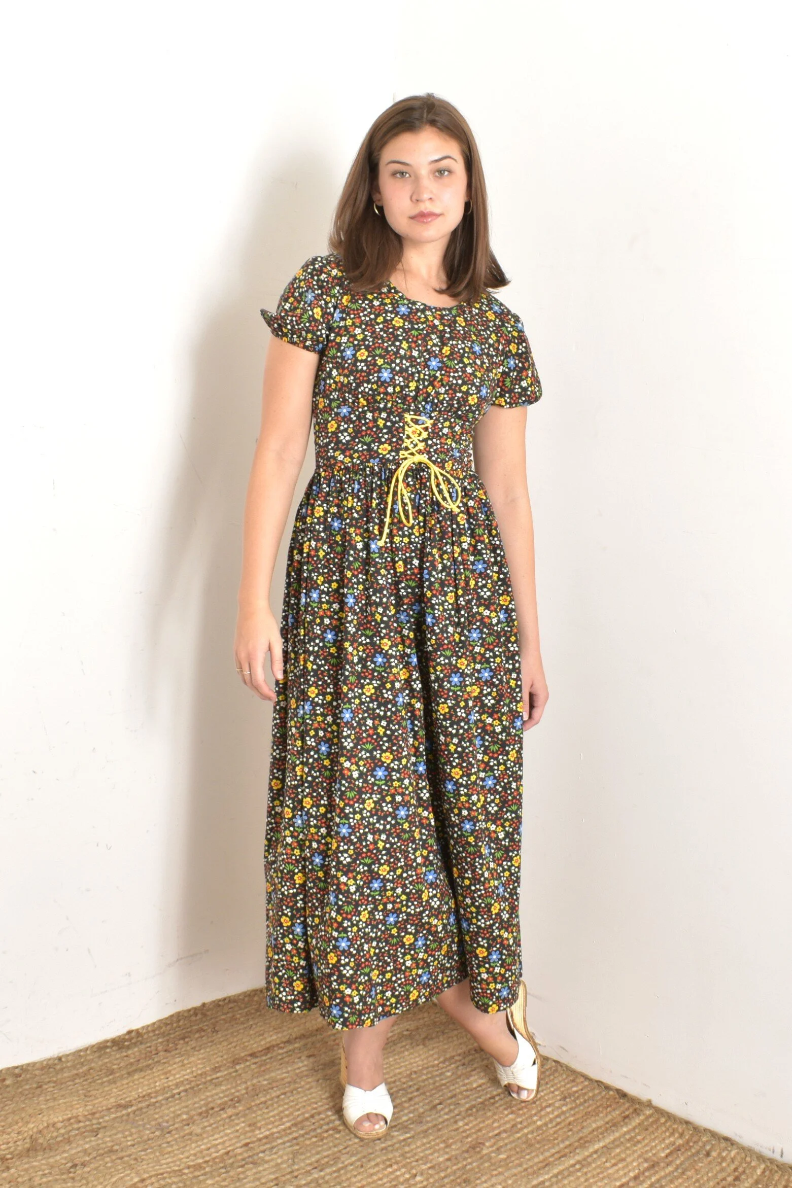 Crazy good 1970s dress done in black floral cotton with a poppy floral print. Rounded neckline, short puff sleeves with elastic trim, fitted wide waistband with yellow corset tie detail, and semi-full maxi skirt. Metal zipper closure at the back.