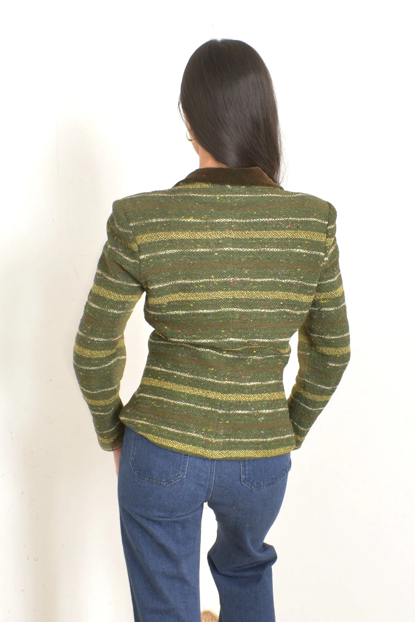 A stunning fall blazer from the ‘40s done in a gorgeous green tweed with colorful specks. Really obsessed with this textile! Green velvet collar and buttons, subtle shoulder pads, long slim sleeves, and slim cut. Lined in lush copper silk.