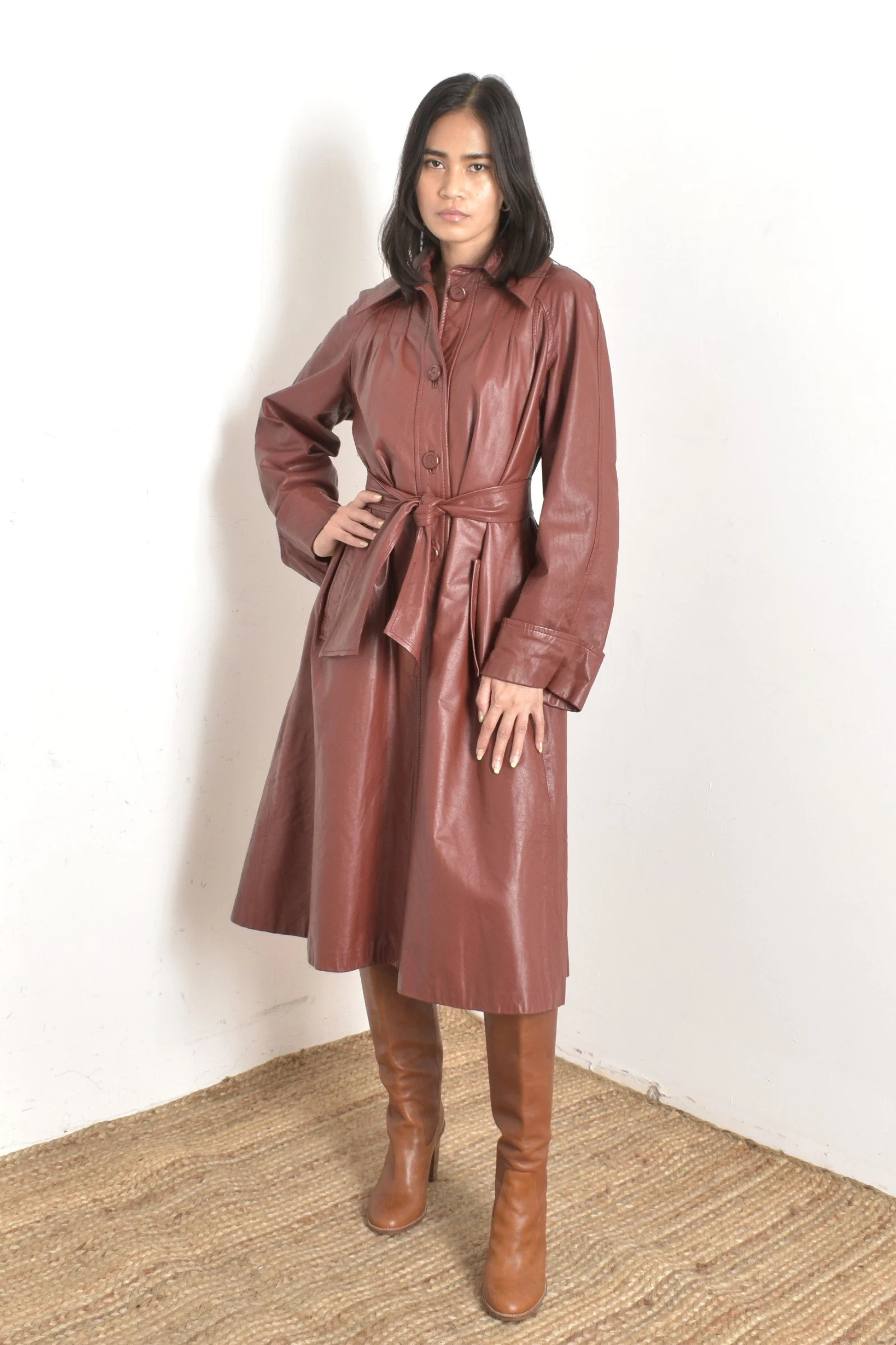 Ultra chic ‘70s leather trench coat in a burgundy-brown hue. Large collar, button front, long sleeves with wide cuffs, flowy shape with belt to cinch the waist, and side pockets. Fully lined. There’s even an extra button sewn inside, love it when that happens!