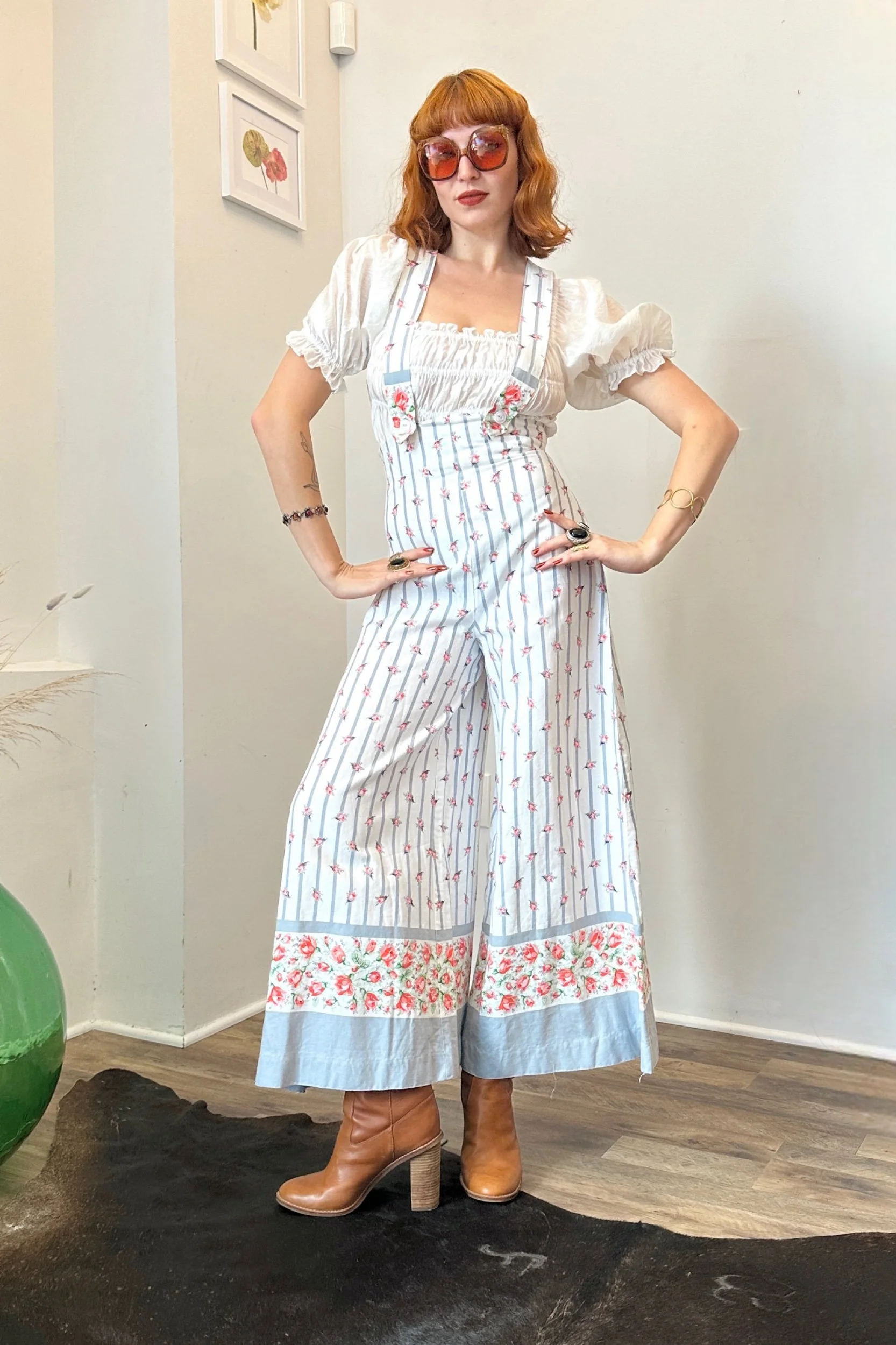 Coolest 1970s wide leg overalls done in a striped and rosette printed cotton! Ultra high waist, overall straps that button at the front and cross in the back, and ultra-wide legs. Zipper closure at the back. Unlined. Such an incredible piece! *blouse is for styling only and is not included